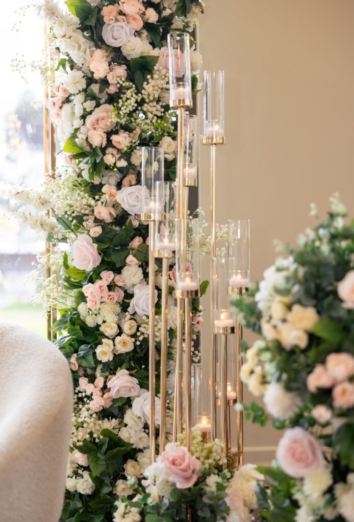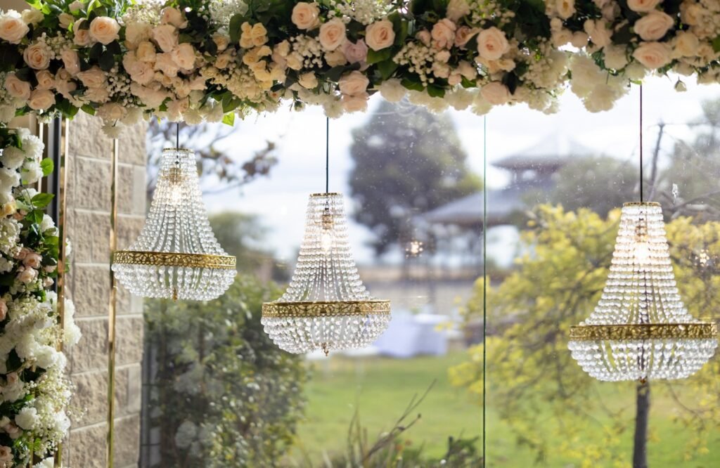 A dreamy ballroom wedding with soft pink florals, twinkling lights, and the couple’s first dance under a canopy of sparklers.