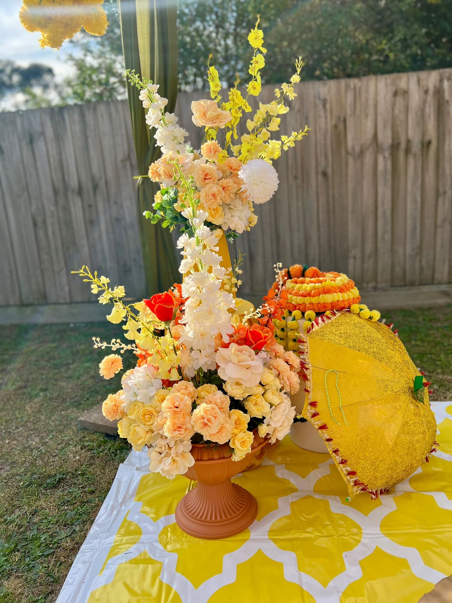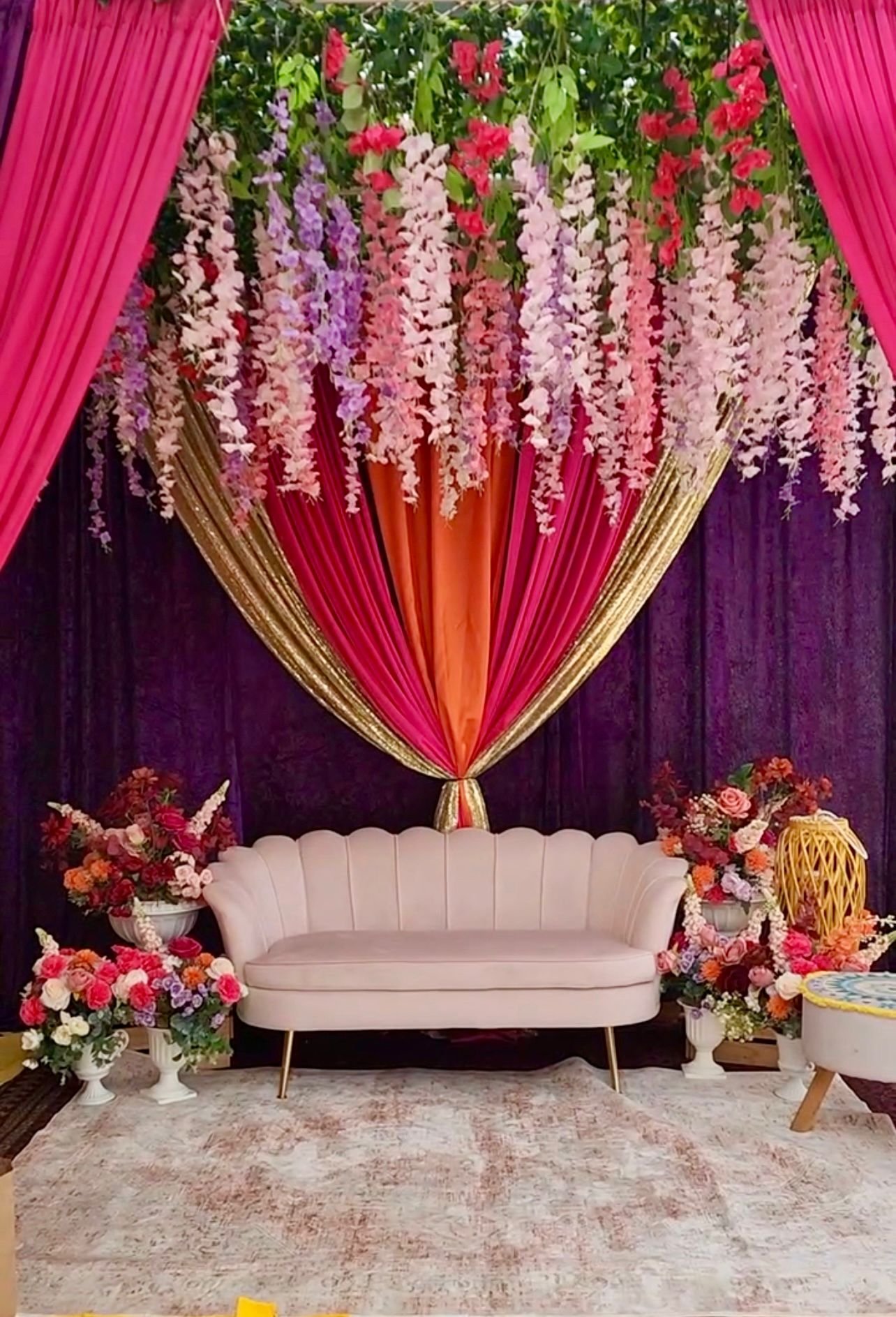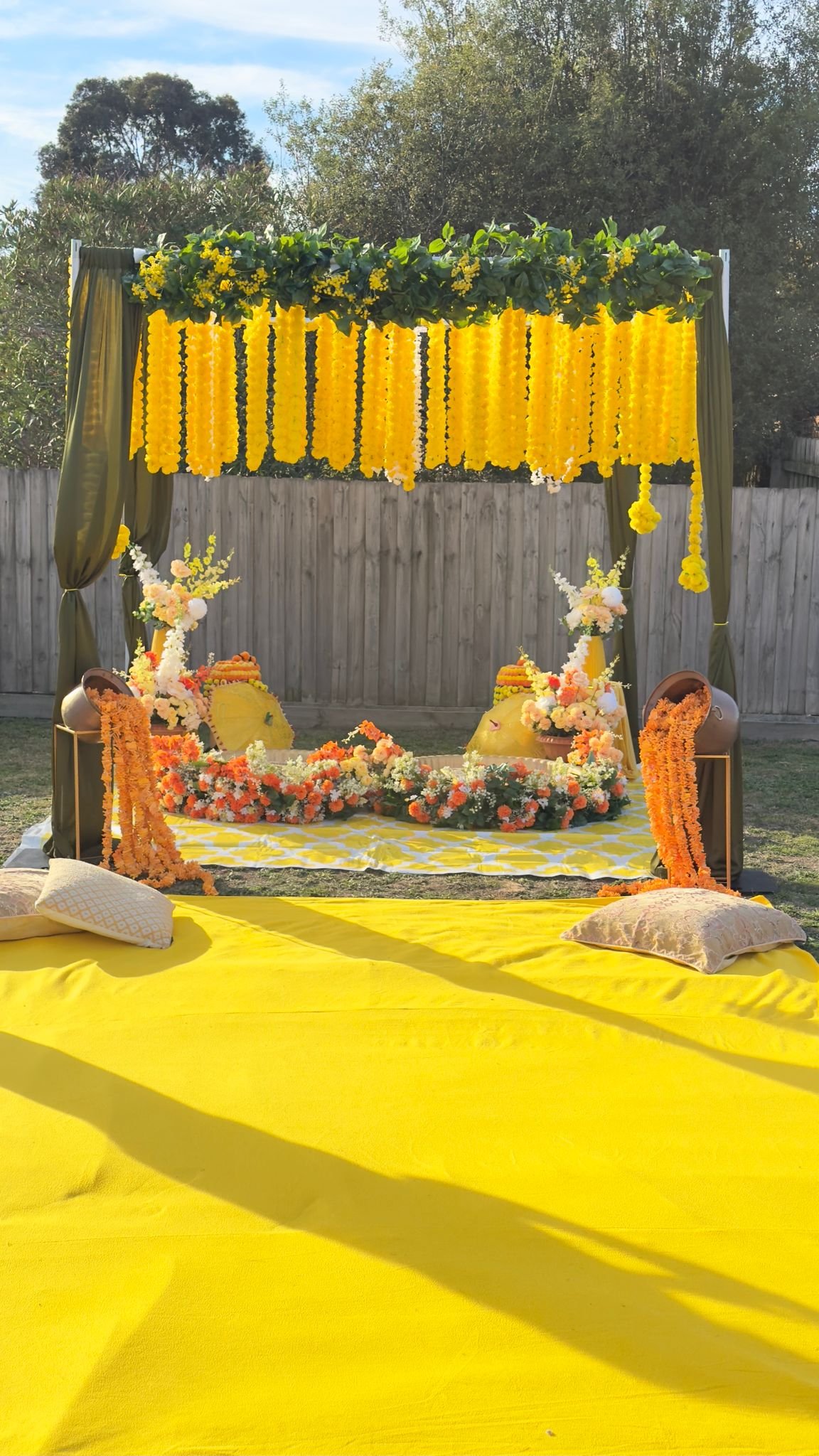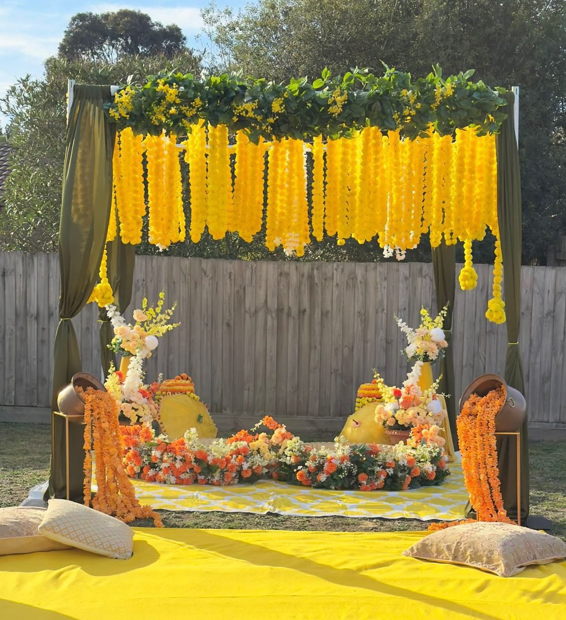 Set in a rustic outdoor venue, this haldi combined earthy tones with pops of yellow and orange florals. We styled a boho-chic seating area that gave a fresh twist to the traditional ceremony.
